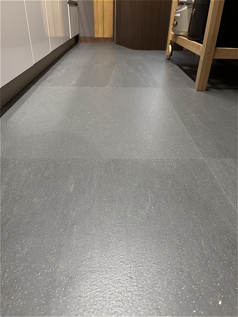 ■キッチンの床には、卵の殻を混ぜた素材を使用。