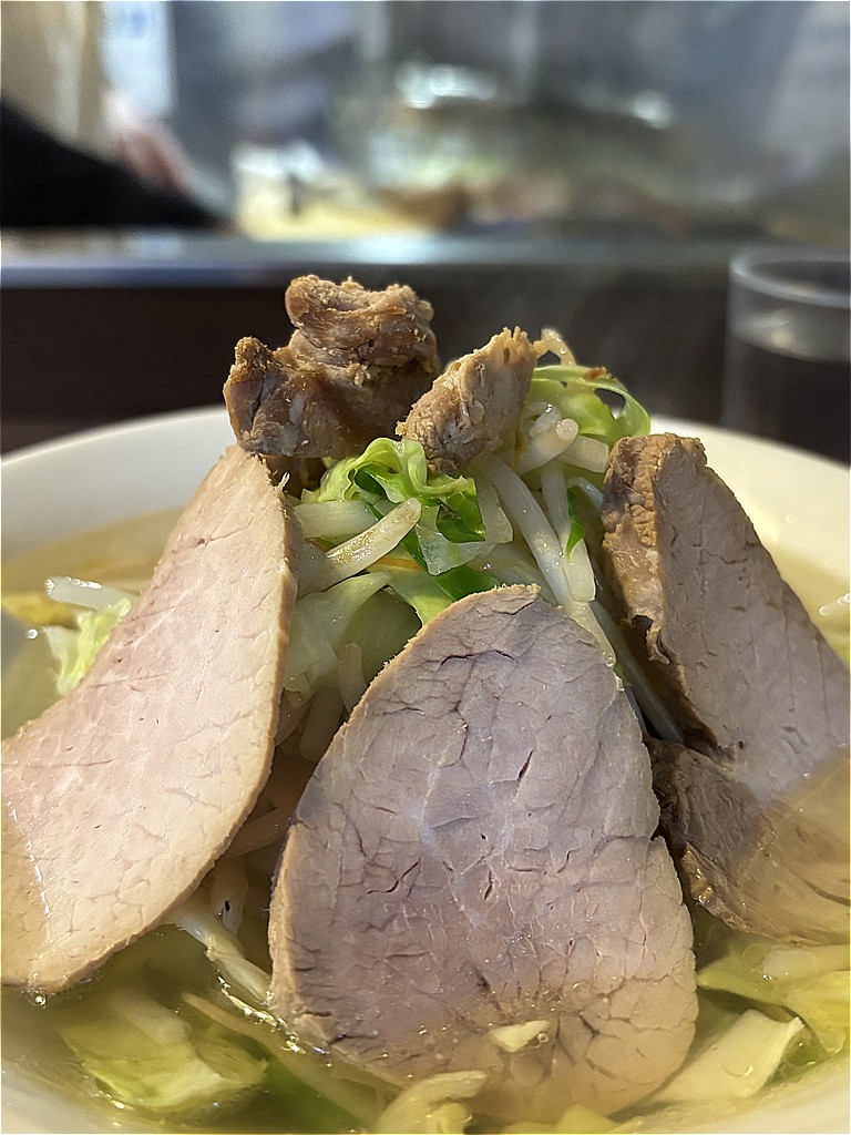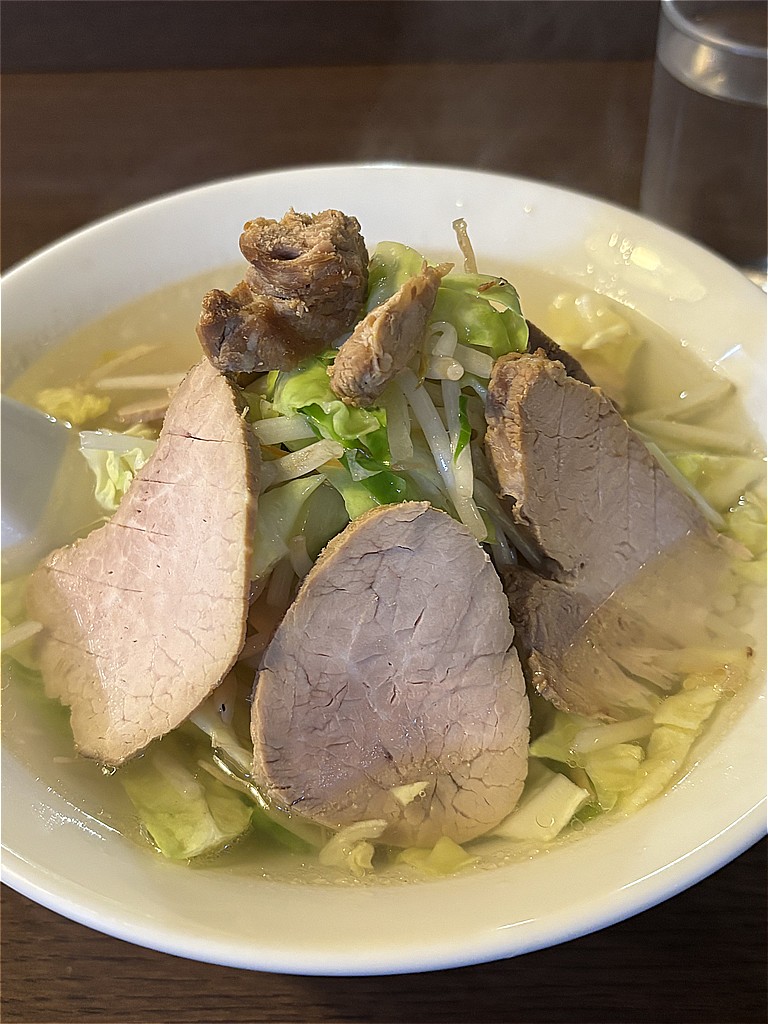 大好物の透き通ったタンメンにトッピングした焼豚。