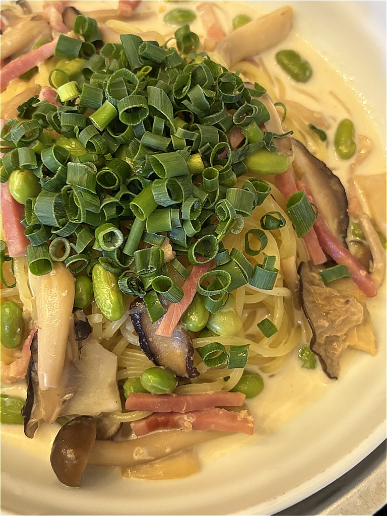 キノコ、ベーコン、えだ豆の醤油仕立て。