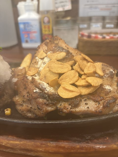 右手に、カリッカリに仕上がってるチキンソテー。