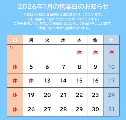 2026年1月 営業日のお知らせです!